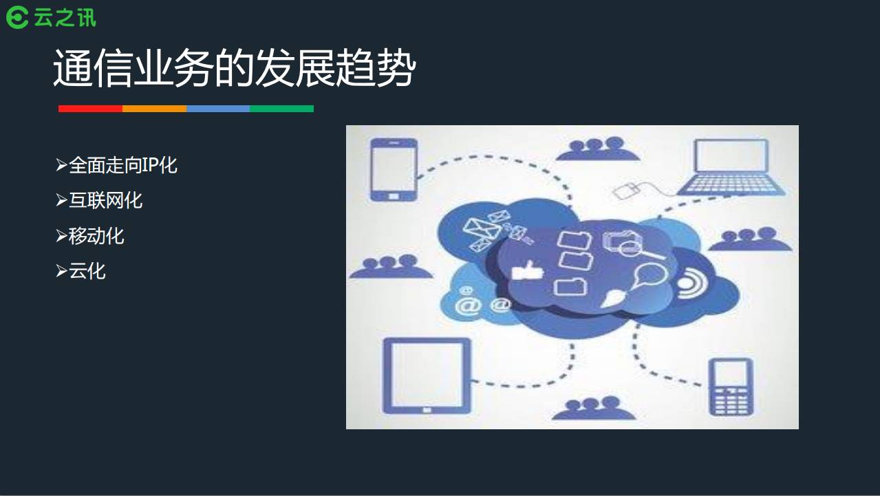 我們看通訊云平臺的構建方式,要看通訊業務的發展趨勢。如果對通訊有所了解,我們會發現,通訊在全面向IP化、移動互聯網化發展。非常傳統的窄帶通訊傳輸,不管在電信網里都是完全IP化傳輸。移動互聯網更不用說,肯定也是在IP化的基礎上進行傳輸,這是一個非常大的發展方向。一是傳統的電信網的通訊服務商,它的通訊能力非常單一,傳統的通訊能力只可能進行語音通話、發短信,無法滿足互聯網的發展需要。二是像微信、QQ做了這個事情,能夠在移動互聯網的場景下做通信。