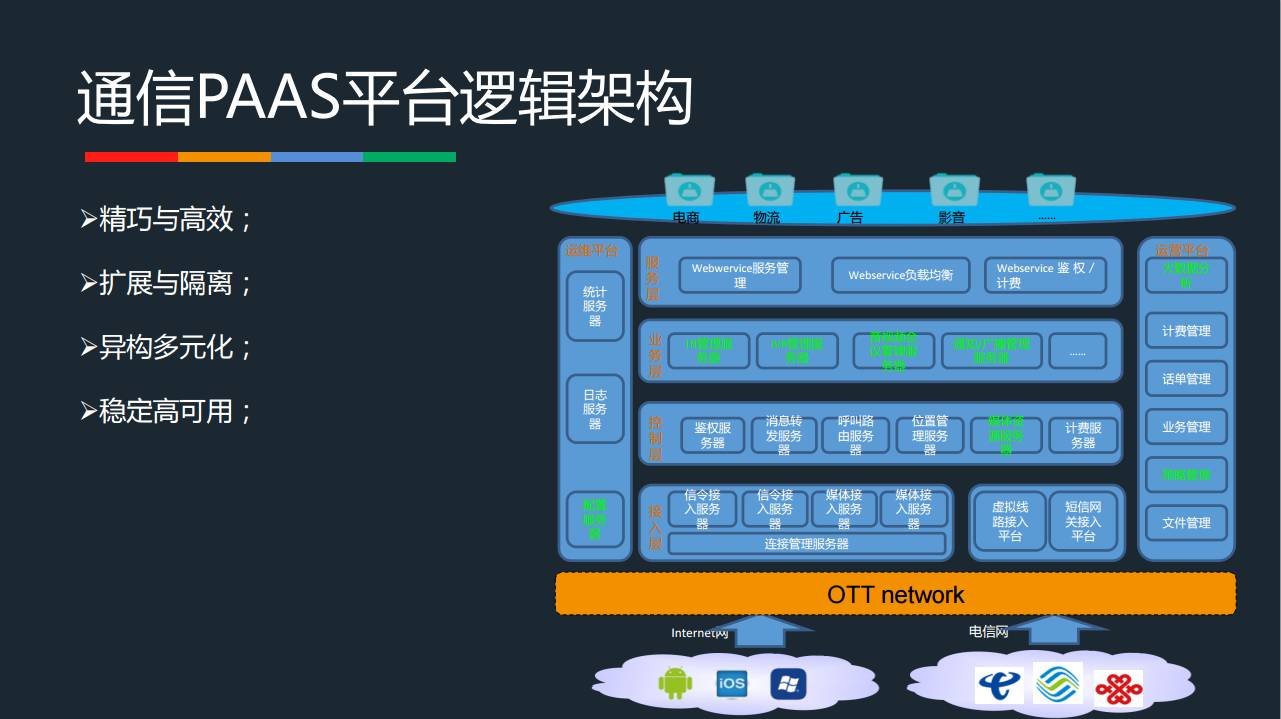 接入層有豐富的接入能力,對于互聯網的接入能力來講,我們需要支持像各種移動端、PC固定端、網頁打電話等技術,它的連接方式主要通過TCP實現的。短信有多的接入方式,可能是HTTP、傳統電信短信的協議。在穩定高可用上,主要構建了OTT通訊網絡,這個網絡是基于公共互聯網的加速網絡,我在這個網絡上跑我的業務,避免通用的互聯網帶給我實時通訊的影響,后面我們也會專門給大家介紹一下。