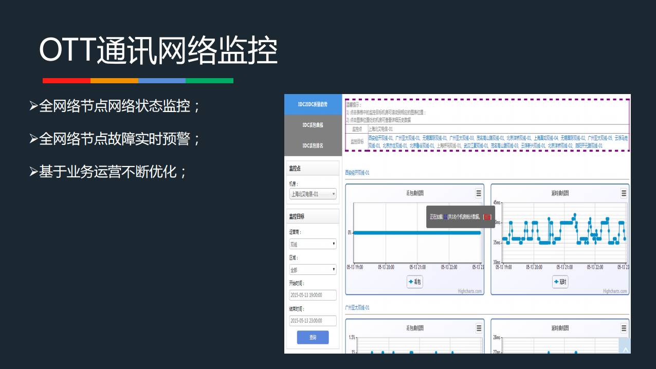 在建設OTT網絡的同時,怎么對網絡進行監控和質量管理。一是全網絡節點網絡狀態監控;二是全網絡節點故障實時預警;三是基于業務運營不斷優化。我會動態根據它的監控情況做調整,某種情況下可以做到自動切換。用戶一般會動態得到兩個以上的節點,離它最近的節點出故障,它會動態選擇次近的節點,不會導致接入失敗。我們會根據業務的情況不斷做調整,這是非常關鍵的。尤其是我們選了這么多點,我們選的每個點在本地不一定是***的,即使當時是***的,長期來講不一定是非常好的,有可能會變壞。