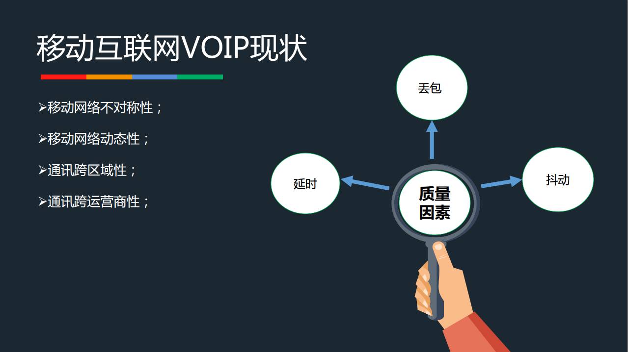 談到網絡,我們要了解互聯網做VOIP的現狀,網絡非常復雜,無論從用戶的接入網絡、骨干傳輸網絡都非常復雜。用戶網絡是Wifi、3G、4G,傳輸網絡是時多種運營商,涉及跨運營商、跨地域的通訊,這對實時通訊的影響非常重要。實時通訊主要看丟包、延遲和抖動。這跟我們通用的互聯網和移動互聯網的差異非常大,在實時通訊里,延遲的要求是幾十毫秒或百毫秒級的,很多互聯網的業務沒什么高要求。丟包,有時候丟包1-2%的時候,非常影響通話的體驗,這在平常的業務上基本沒有感知。