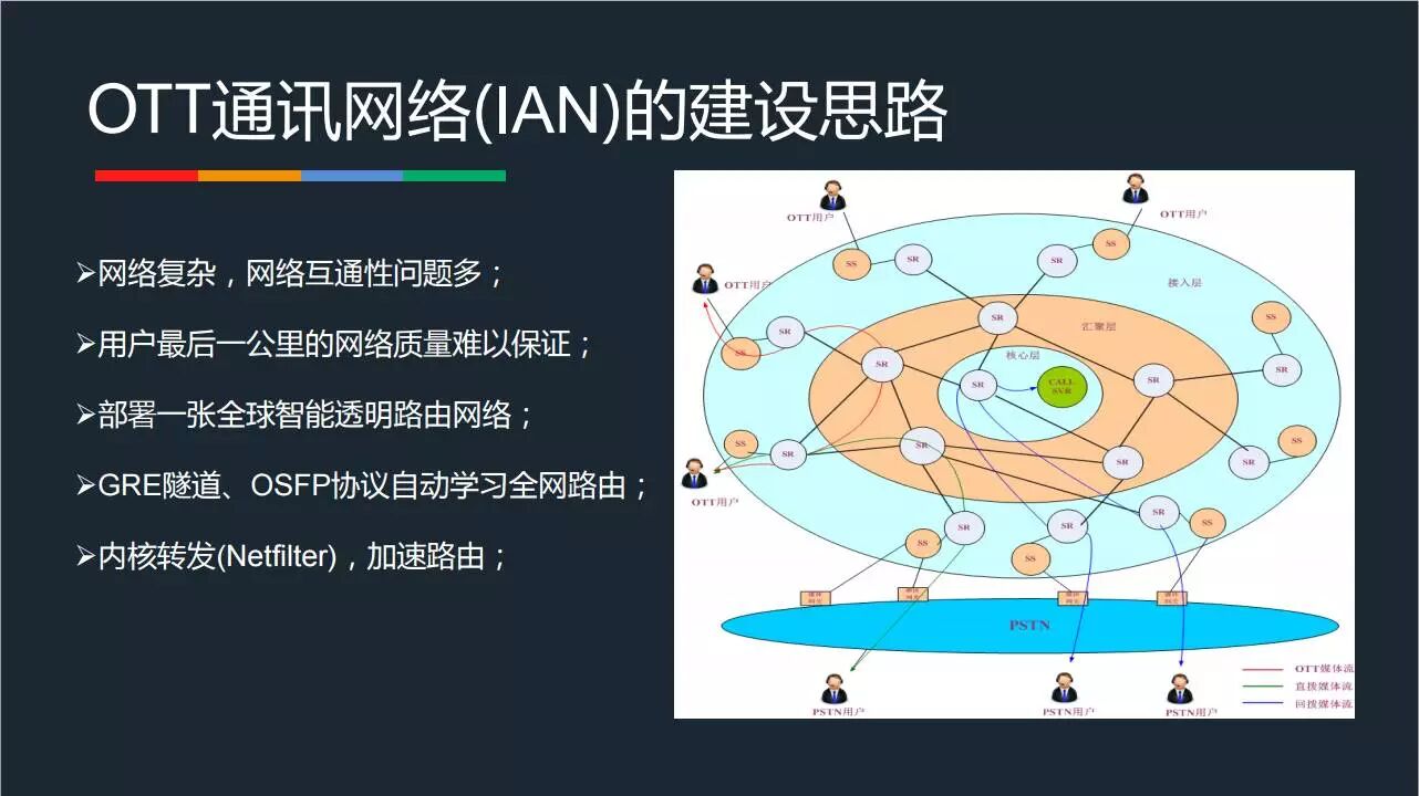 所有的問題導致了我們在做通訊云平臺的時候遇到了各種各樣的困難,我們怎么做?這也是回到剛才我們所說的OTT網絡建設上,一個透明的智能路由網絡,這是我自建的加速平臺,包括谷歌、騰訊、YY等***的互聯網通訊都有網絡。這個網絡很大程度上可以加速我的通訊服務,保證通訊質量,解決網絡復雜以及***一公里的問題。