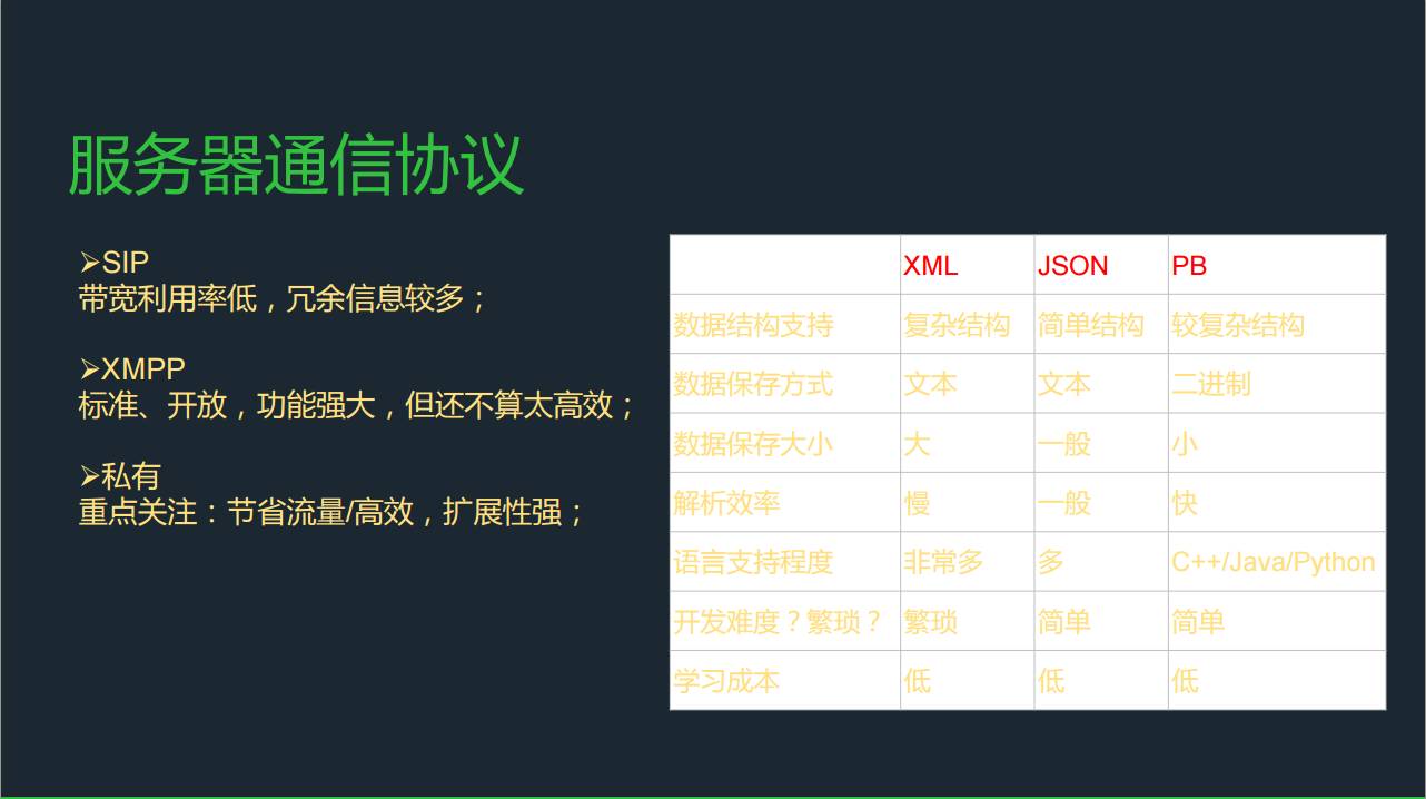 通過業務運營的數據做判斷,我們在通訊里語音,它有一些值,如果這個值在持續下降,我會把這個點撤掉,選擇更好更新的節點替換它。通過網絡,還有一些需要優化的東西,這跟剛才說的不太一樣,剛才說的都是HTTP等協議,這里基本不用HTTP,我們用得比較多的是SIP、XMPP、私有協議,我們選擇的是私有協議。私有協議類似于完全二進制,自己編碼、解碼實現,這種效率是***的,尤其是針對移動互聯網的場景。