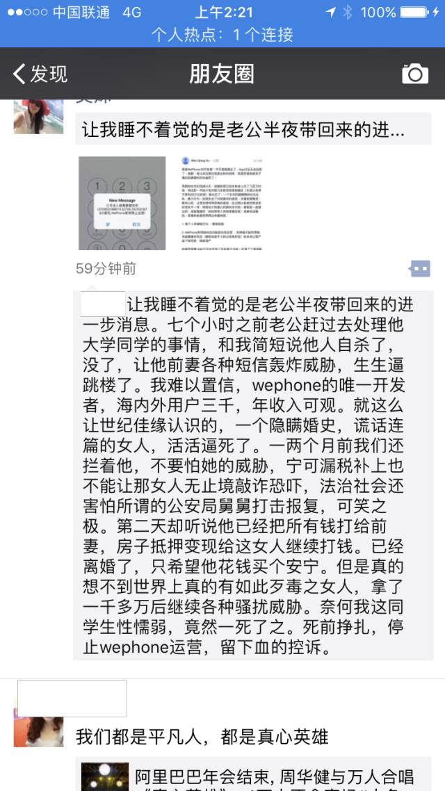 到家我告訴太太你走了,她都不相信,后來(lái)阿淼給我看了一篇關(guān)于你的報(bào)道,原來(lái)發(fā)生的這么快,你還寫(xiě)出來(lái)真相了,這些文字看的我句句戳心,我能想象到你受的委屈。你一直是很優(yōu)秀的家伙,從來(lái)沒(méi)有經(jīng)歷過(guò)失敗吧,遇到這樣一個(gè)毒婦,被威脅,被罵,被侮辱,被踐踏人格,我知道這種的感受,你的性格不會(huì)更強(qiáng)硬對(duì)她,我知道你一直是個(gè)很善良對(duì)人好的人。