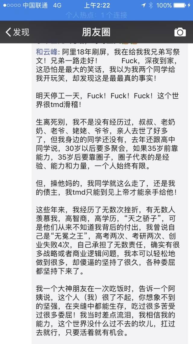 這半年多,是我最煎熬的時(shí)候,這幾年互聯(lián)網(wǎng)創(chuàng)業(yè)弄得頭破血流,給自己挖了大坑,真心沒(méi)臉見(jiàn)大家,現(xiàn)在我馬上走上正軌,你卻走了,你知道么,我欠所有幫過(guò)我的人的情和債,就像刀子一樣扎在我心里,我很要強(qiáng),太好面子,該死的自尊心,相信別人卻誤了自己的信用。