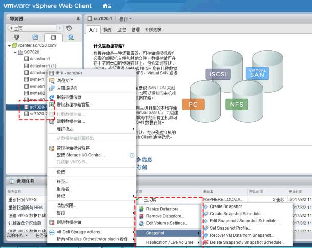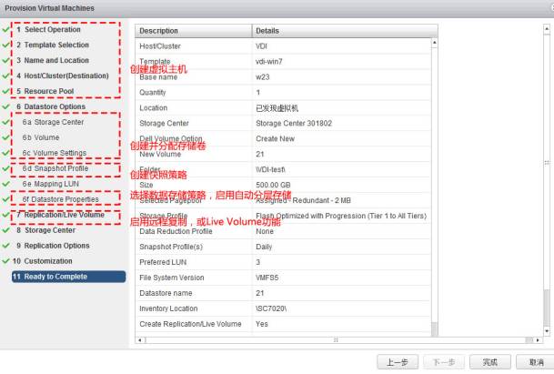 成功避開高峰, 李剛順利回到家, 整理好今天的測試結果, 正準備給CIO的匯報材料, 沒想到CIO就打電話過來了, 下達了一個新的任務。 由于業務規模擴大, 客服部門和電銷部門即將擴張人員500名, 而且這些服務人員都需要使用VDI桌面環境…… ” “存儲設備的性能早已達到了極限,再增加500個VDI桌面?存儲設備肯定要跪了。”李剛直接在電話里就和CIO提到存儲的性能瓶頸問題,同時又大概介紹了下今天的測試情況。CIO讓李剛評估一下,“如果確有需要,可以再申請采購一臺存儲,畢竟業務蒸蒸日上,不能IT扯后腿,對了,你把今天的測試結果寫一份簡報發郵件給我!” 能購買新的存儲設備來,這對于李剛來說,無疑是天上掉了大餡餅,心里稍定,但仍不敢大意。 盡管戴爾SC7020證明了其能夠有力地支撐傳統架構的數據庫類應用,但對于以VDI為典型代表的虛擬化環境,當把物理機轉換為虛擬桌面之后,不僅需要更高的性能、帶寬和容量,還需要更簡化的管理。由于虛擬化層的添加,如何讓應用更好地使用存儲,或者存儲系統透明地感知應用的需求? 一臺存儲輕松搞定100個VDI 由于公司現有的VDI環境使用的是VMware vSphere平臺,而且VMware有一項Virtual Volume技術(簡稱“VVOL”),能夠有效提升存儲的性能利用率。一般而言,SAN存儲用于虛擬化環境,即使是同一存儲系統的兩個Volume(或者說LUN)分配給同一物理機上的不同虛擬機,如果這兩個虛擬機之間要進行數據傳輸,數據會先讀取到服務器HBA,然后再寫回到存儲,具體可見下圖左。 不使用Virtual Volume(圖左)和使用Virtual Volume(圖右)的數據傳輸示意圖(紅色箭頭) 如果存儲系統能夠支持Virtual Volume技術的話,就可以通過vCenter開放的API將存儲系統的能力“告知”vCenter,從而可以將數據傳輸的任務卸載到存儲系統完成。同樣是將虛機A的數據傳輸給虛機B,利用對Virtual Volume的支持,數據傳輸完全可以在存儲系統內部完成,存儲系統內部的數據傳輸性能遠高于外部網絡,響應時間更低,且減少了對外部網絡和主機資源的消耗,效率自然會高出許多。 從搜集到的資料上來看,SC7020能夠很好地支持VVOL這項技術,相信對于虛擬化環境的存儲性能有不錯的提升。但是,VVOL解決的是性能的問題,并不能解決管理復雜的問題,而這對于李剛所在的部門而言,也是必須要解決的難題。 李剛又一次跟老同事進行溝通,誰讓老同事在這方面有經驗呢。老同事很迅速地說出“Dell Storage vSphere Web Client Plugin”(簡稱Plugin,或插件)——這實際上是一個模板虛機,只要導入到vSphere平臺,然后設置好IP地址,保證能同時與vCenter和SC7020存儲管理IP通信就可,無需人工安裝。同時,老同事還發來幾張截圖。 紅框中顯示的“Dell Storage”即是安裝好Plugin插件之后,在vSphere Web Client中所新增的一個功能按鈕 通過點擊這個按鈕,可以監控SC7020存儲系統的監控狀況和使用情況。上圖中的SC7020有“Degraded(降級)”標志,據老同事解釋,他們當時正在做“拔盤”模擬硬盤故障操作,以檢驗SC7020的數據安全性,測試證明SC7020能夠很好地監控到,并能做出秒級響應 這只是Plugin的監控功能,而接下來的幾張圖則引起了李剛的極大興趣。 可以直接選定某臺ESXi主機,為其創建存儲卷 管理人員可以直接在vSphere Web Client中直接對某一個Volume進行擴容、快照、復制或者設置Live Volume,這個卷既可以為某個特定應用負載的虛機提供存儲,也可以為一組核心桌面組提供存儲,為其提供相同的存儲策略或者數據保護方式。如果沒有這個插件,通常情況下,是需要進入到存儲系統的管理后臺去進行快照、卷擴容等操作。將這些管理功能集成到vSphere Web Client中,大幅簡化了虛擬化環境存儲的管理 不僅于此,通過Plugin插件,還可針對具體的某一個虛擬機進行存儲的增刪,或者快照等操作,比如。 通過Plugin插件,直接使用Web Client對某個虛擬機的存儲進行管理 還有更讓李剛驚喜的是,利用Plugin插件,在Web Client中創建虛機的同時,還能分配存儲,以及存儲策略等一系列操作,并且都是在同一個界面完成,虛機存儲的管理與維護更加方便。 通過Plugin插件,可以在Web Client的同一個圖形界面中完成虛擬機(VM)的創建、存儲的分配,以及數據保護策略等等,除了***步“創建虛擬機”是vCenter的功能外,后續幾步操作都是SC7020的功能。在虛機創建之初就對其做好完善的數據保護策略,不僅管理更便捷,而且顆粒度更細 在詳細了解了Dell Storage vSphere Web Client Plugin的功能與作用之后,李剛不禁信心大增,SC7020的性能滿足應用所需,減少針對運維部門的投訴;同時,還能大幅簡化虛擬化環境的存儲管理,讓運維兄弟們的效率更加高效。興奮之余,李剛竟然快速地想好了虛擬化環境的測試方案。 李剛構想的基于VMware Horizon View的VDI測試方案,因為僅用于測試SC7020存儲的性能,所以簡化部署,不用安裝副本服務器和安全服務器。李剛計劃在關閉/開啟VVOL功能下測試全克隆/鏈克隆100個虛擬桌面的部署速度。同時對比開啟/關閉數據壓縮和重復數據消除功能下的存儲空間效率。 之所以全克隆和鏈克隆都要測試,原因在于這兩種虛擬桌面采用不同的克隆方式,有不同的特性。比如鏈克隆在大規模部署時速度更快,占用更少的存儲空間,且對存儲性能的需求更少。而全克隆采用完整虛擬桌面復制,有更好的性能,適合管理層以及核心部門,但對存儲系統的容量和帶寬都有較高的需求。這兩種克隆方