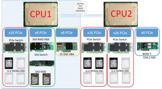一只南美洲亞馬遜河流域 熱帶雨林中的蝴蝶, 偶爾扇動(dòng)幾下翅膀, 可以在兩周以后引起 美國(guó)德克薩斯州的一場(chǎng)龍卷風(fēng)。 驅(qū)動(dòng)整個(gè)行業(yè)技術(shù)變革的觸發(fā)點(diǎn) 可能只是一個(gè)小小的組件, 比如NVMe SSD。 當(dāng)采用PCIe x8通道的NVMe SSD 帶來(lái)100萬(wàn)+ IOPS, 終于把CPU變成了瓶頸, 一場(chǎng)主流2U服務(wù)器風(fēng)暴正在登陸中。 ” NVMe SSD的性能有多高?常見(jiàn)PCIe 3.0 x4通道的NVMe SSD,4KB隨機(jī)讀取性能接近80萬(wàn)IOPS已經(jīng)不是新鮮事,采用PCIe x8通道的NVMe SSD更是可以獲得100萬(wàn)+的IOPS。 風(fēng)暴前兆 當(dāng)CPU成性能瓶頸 性能高也有“煩惱”,比如我們突然發(fā)現(xiàn)CPU的性能不夠了——硬盤(pán)時(shí)代,大家常說(shuō)存儲(chǔ)是系統(tǒng)的性能瓶頸,經(jīng)過(guò)SATA SSD的過(guò)渡,PCIe到NVMe SSD,終于把CPU變成了瓶頸。提高CPU性能有兩大手段:高主頻與多內(nèi)核。不管用哪個(gè)手段,最終都反應(yīng)為能耗的一路攀升。今年7月剛剛發(fā)布的至強(qiáng)可擴(kuò)展處理器(Xeon SP)功耗已經(jīng)突破200W,比上一代的至強(qiáng)E5 v4高出近50%,對(duì)普遍采用風(fēng)冷散熱的通用服務(wù)器而言,結(jié)構(gòu)設(shè)計(jì)的功力空前重要。 并且,NVMe SSD的性能發(fā)揮的前提是高速的PCIe通道。一個(gè)U.2接口的NVMe SSD需要PCIe x4,而每個(gè)至強(qiáng)SP提供48條PCIe 3.0通道,比前代提高20%。雙路至強(qiáng)SP服務(wù)器共有96條PCIe 3.0通道,全部用上正好支持24個(gè)U.2的NVMe SSD,剛好對(duì)應(yīng)主流2U服務(wù)器的24個(gè)前置2.5英寸盤(pán)位設(shè)計(jì)。即使考慮到PCH、網(wǎng)卡以及其他必要組件也要占用PCIe通道,實(shí)際上能支持的NVMe SSD數(shù)量不會(huì)有那么多,但CPU也未必吃得消啊…… 考驗(yàn)服務(wù)器設(shè)計(jì)能力的時(shí)候到了,尤其是U.2 NVMe SSD的加入。一方面2U標(biāo)準(zhǔn)機(jī)箱內(nèi)的高性能(通常意味著高能耗)組件更多,需要更好的散熱設(shè)計(jì);另一方面,如何去兼顧NVMe SSD的性能,同時(shí)繼承雙路服務(wù)器“多面手”的優(yōu)良傳統(tǒng)? 掀起主流2U服務(wù)器風(fēng)暴 新處理器的推出必然帶動(dòng)新一輪服務(wù)器升級(jí),在英特爾正式發(fā)布至強(qiáng)SP家族的當(dāng)天,戴爾也同步推出了基于該系列處理器家族的第一波14G服務(wù)器,包括肩負(fù)更新主流2U市場(chǎng)重任的PowerEdge R740/R740xd。在2017戴爾科技論壇(DTF)舉辦之前,企事錄實(shí)驗(yàn)室獲得了一臺(tái)配置誠(chéng)意滿(mǎn)滿(mǎn)的Dell PowerEdge R740xd服務(wù)器:雙路Xeon Gold 6130處理器(8張圖速覽新至強(qiáng):Skylake架構(gòu)、外貌與型號(hào))、384GB DDR4-2666內(nèi)存,雙M.2 SSD配置的BOSS(Boot Optimized Storage Solution,優(yōu)化啟動(dòng)存儲(chǔ)方案)卡,(支持RoCE的)雙端口25GbE網(wǎng)卡,以及最重要的4塊U.2 NVMe SSD。