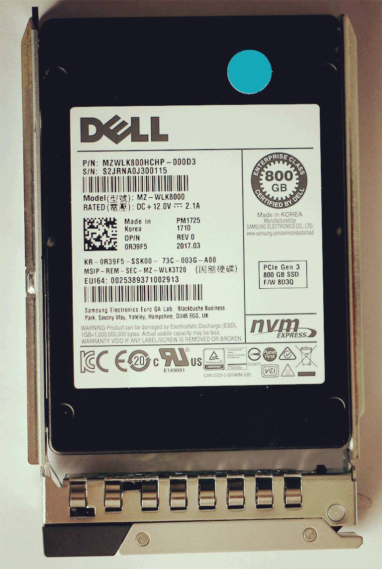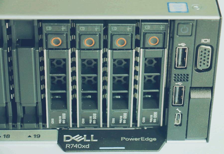 乍一看,作為新一代的R740xd跟以前的13G服務(wù)器好像沒(méi)什么區(qū)別,但細(xì)看卻大有不同。先看前面板,注意最右4塊盤(pán),就是高性能的U.2規(guī)格NVMe SSD,來(lái)個(gè)特寫(xiě): 4塊800GB的U.2 NVMe SSD,加上內(nèi)部的Xeon Gold 6130處理器和384GB內(nèi)存,讓我們充滿(mǎn)期待。