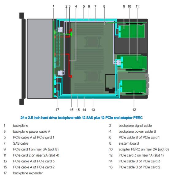 R740xd內(nèi)部照,尾部的兩個(gè)PCIe ×16插槽上各連接了一個(gè)扣著銀色散熱片的PCIe Card,這實(shí)際上是連接前面板U.2 NVMe SSD的PCIe擴(kuò)展卡。